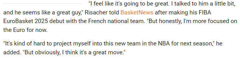 2025-08-29 09:40北京时间8月29日,法国男篮球员里萨谢接受媒体采访,谈到了老鹰队在休赛期的引援操作,并点赞了关于波尔津吉斯的交易。