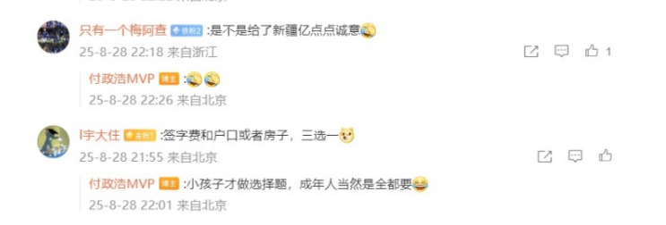 至于赵睿,他除了能从北京队拿到巨额签字费,还有望获得其他补偿。媒体人付政浩在回复网友“签字费、户口或房子三选一”时就表示:“小孩子才做选择,成年人当然是全部都要。”