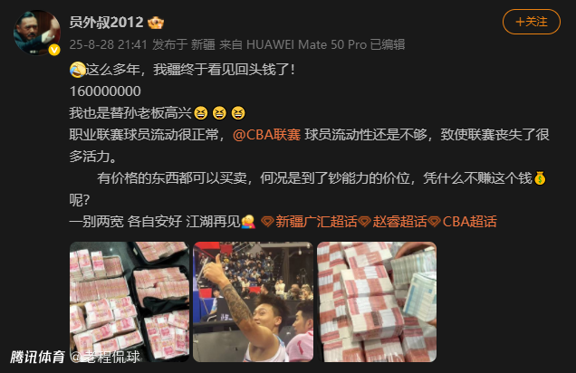 “这么多年,我疆终于看见回头钱了!160000000,我也是替孙老板(新疆男篮老板)高兴。职业联赛球员流动很正常,CBA联赛球员流动性还是不够,致使联赛丧失了很多活力。有价格的东西都可以买卖,何况是到了钞能力的价位,凭什么不赚这个钱呢?一别两宽,各自安好,江湖再见!”该球迷在社媒上写道。