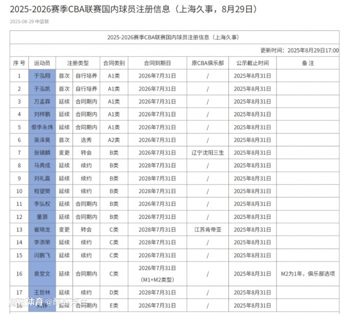 2025-08-30 07:20北京时间8月29日,CBA官网公布上海男篮注册18名球员,其中王哲林续约3年D类顶薪合同,张镇麟与崔晓龙两位国字号球员转会加盟,李添荣续约3年C类合同,刘礼嘉续约3年B类合同,闫鹏飞续约1年C类合同。