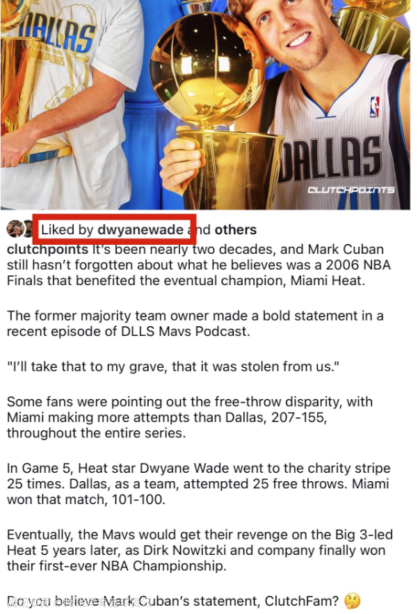 这是啥操作?韦德点赞库班言论 后者曾表态06年总冠军被偷走