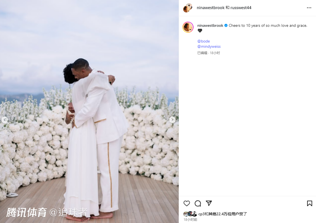 威少在社媒上晒出庆祝结婚10周年的浪漫恩爱照,NBA众星集体送祝福,库里、保罗、乐福、塔图姆、乔治、施罗德、比尔、兰德尔都为威少点赞;值得一提的是,前几天,比尔与爱妻米西娅补办了一场盛大婚礼,杜兰特、塔图姆等人到场祝贺。