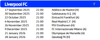 利物浦欧冠联赛阶段赛程:(均为北京时间)