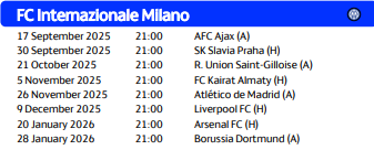 国际米兰欧冠联赛阶段赛程:(均为北京时间)