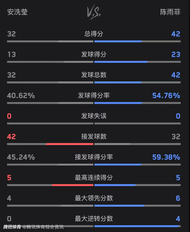 双方技术统计如下(陈雨菲在前):总得分43-32、发球得分23-13、发球得分率54.76%-40.62%。