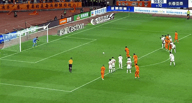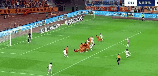 反客为主!第32分钟,亚泰获得弧顶前任意球机会,张华晨主罚直接打门,皮球越过人墙后击中横梁下沿弹入球门,亚泰1-0领先。