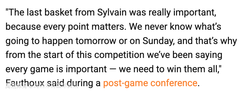 赛后法国男篮主帅福图在新闻发布会上,也谈及此事,他表示:“弗朗西斯科的最后一投至关重要,因为每一分都可能决定胜负。我们永远不知道明天或周日(当地时间)会发生什么,这就是为什么从比赛一开始,我们就一直强调每场球都很关键,我们必须全力拿下胜利。”