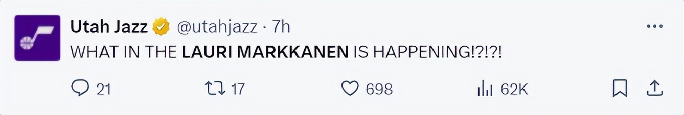 欧洲杯期间爵士队官方也终于获得了流量密码,几乎每一条推文都跟马尔卡宁有关,马卡在欧洲杯的表现实在是过于炸裂,全世界的球迷都被马卡FIBA大杀器的表现折服。