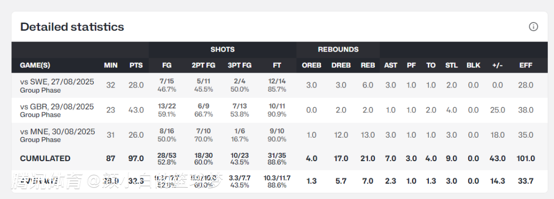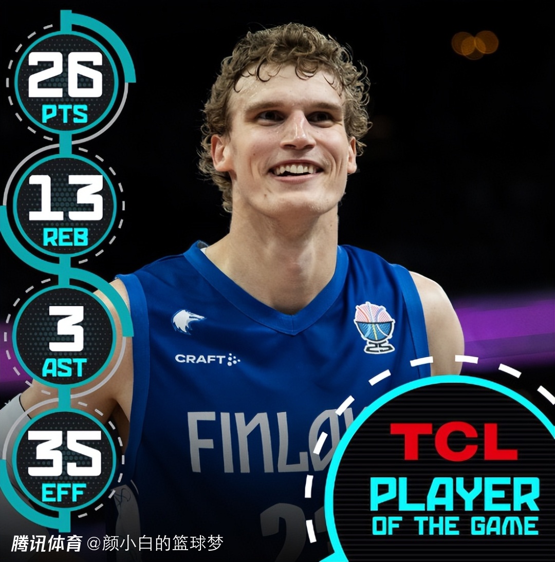 这场比赛劳里-马尔卡宁依旧是芬兰最出色的那个,尤其是第三节他单节拿到9分彻底浇灭了黑山的反扑气焰,全场比赛31分钟,16中8,三分6中1,罚球10中9,拿到26分13篮板3助攻3抢断1失误,命中率50%,正负值+18,效率值+35。