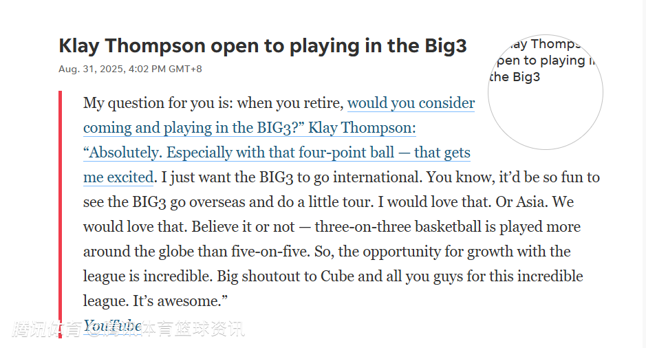 2025-08-31 16:40北京时间8月31日,独行侠后卫克莱做客节目时,谈到了关于BIG3联赛的话题。