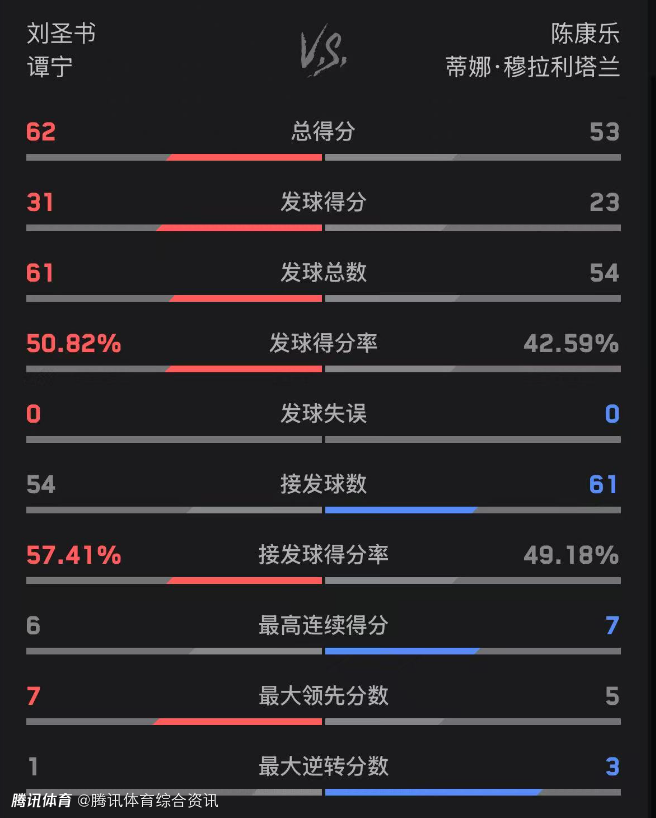总得分62-53、发球得分31-23、发球得分率50.82%-42.59%。