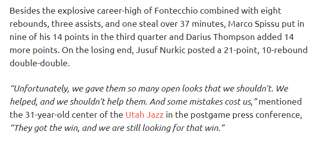 努尔基奇:我们给了对手太多空位自身失误也多 接下来还要为首胜努力