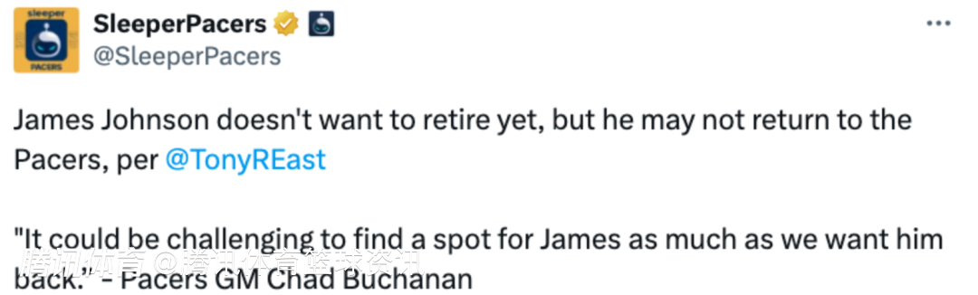 2025-09-01 11:30北京时间9月1日,据步行者队记Tony East报道,老将詹姆斯-约翰逊不会退役,但可能不会回归步行者。