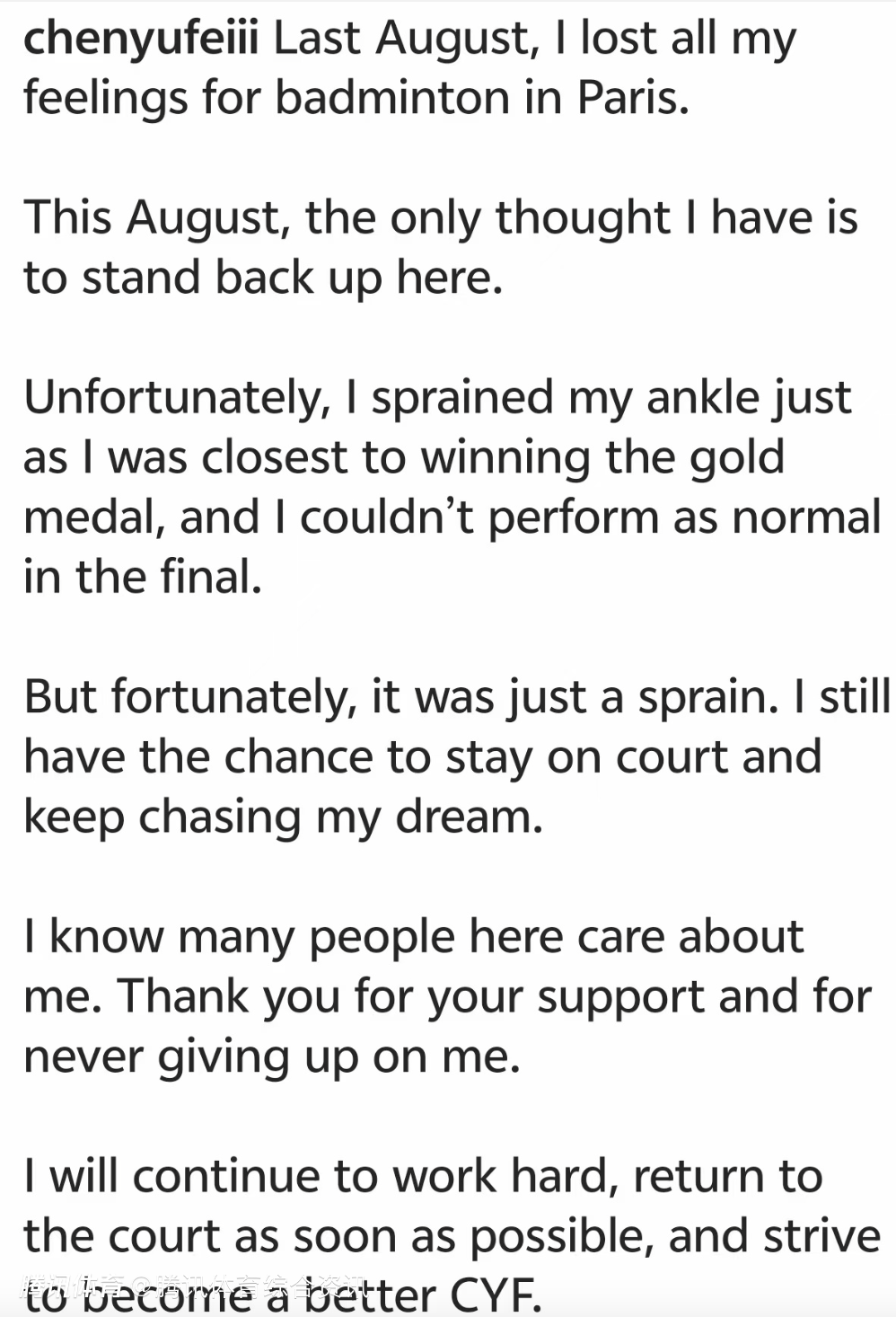 我会继续努力,尽快重返赛场,努力成为更好的陈雨菲。