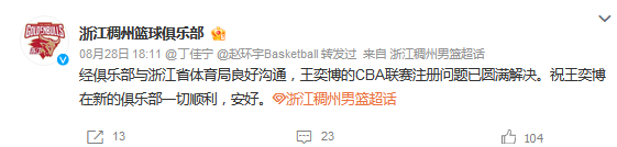 王奕博经纪人先是在8月27日拿到了浙江省体育局盖章的注销证明,此后又前往浙江男篮俱乐部盖章。