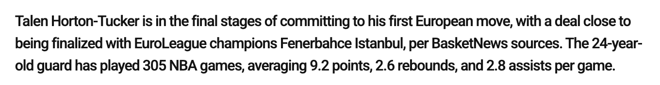 消息人士表示,小塔克目前只有两个选择:加盟费内巴切或等待NBA球队合同,他留在NBA的可能性仍然存在。但如果NBA的机会不能如他所愿,预计小塔克会开启海外职业生涯,加盟费内巴切。