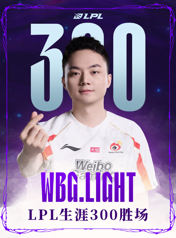 2025-09-01 18:309月1日,WBG对战UP的比赛中,Light使用烬达成了在LPL的第300次胜场,是第26位达成该成就的选手,恭喜Light!