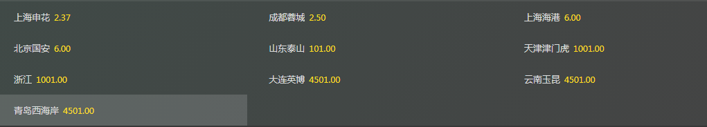 上轮战罢之后,申花以2.10的赔率成为头号夺冠热门,上海海港以3.50排名第2,国安以4.33位列第3,成都蓉城则是5.50排名第4。