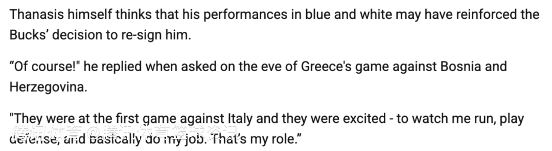 字母哥哥认为,自己在希腊队的表现,可能坚定了雄鹿和他重新签约的决心,他在近期接受媒体采访时说道:“当然是这样,他们看了对阵意大利的首场比赛,看到我奔跑、防守,基本上做好自己的本职工作,他们很兴奋。那就是我的角色。”