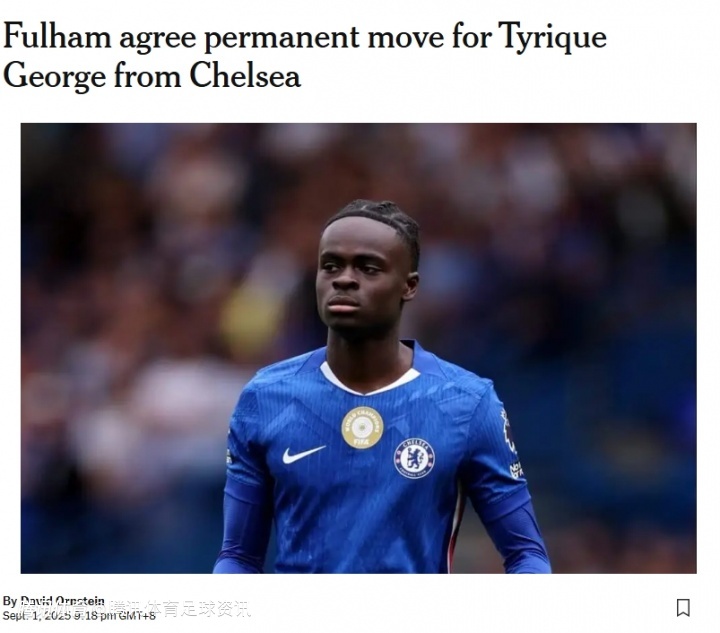 2025-09-01 21:30北京时间9月1日,据The Athletic记者奥恩斯坦独家报道,英超俱乐部富勒姆已经与切尔西19岁小将乔治达成转会协议。