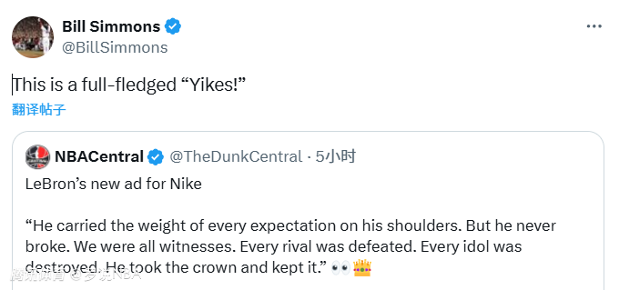 名嘴比尔-西蒙斯吐槽这条广告太尴尬:“这是一个真正的‘哎呀’!”詹姆斯面临着不少批评声,很多球迷的观点与西蒙斯一致——