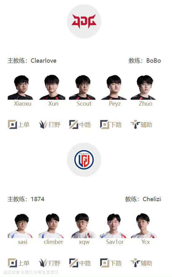 JDG:上单Xiaoxu、打野Xun、中路Scout、下路Peyz、辅助Zhuo;