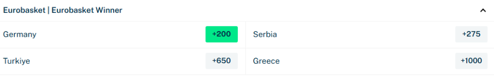 1.德国+200、2.塞尔维亚+275、3.土耳其+650、4.希腊+1000、5.法国+1500、6.西班牙、立陶宛、意大利同为+3000、9.拉脱维亚+4000、10.芬兰和斯洛文尼亚同为+5000。