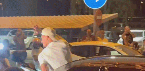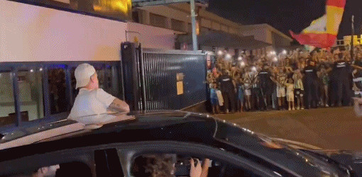 贝蒂斯俱乐部体育总监法哈尔多亲自驾车,迎接安东尼。听到车外的欢呼声,25岁的圆神将身体探出车外,振臂庆祝转会成功。