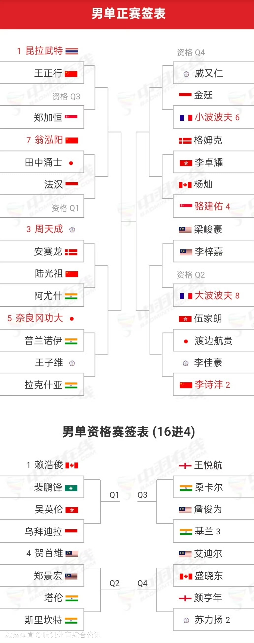 中国香港羽毛球公开赛签表出炉:李诗沣对阵李佳豪 韩悦将战波恩皮查