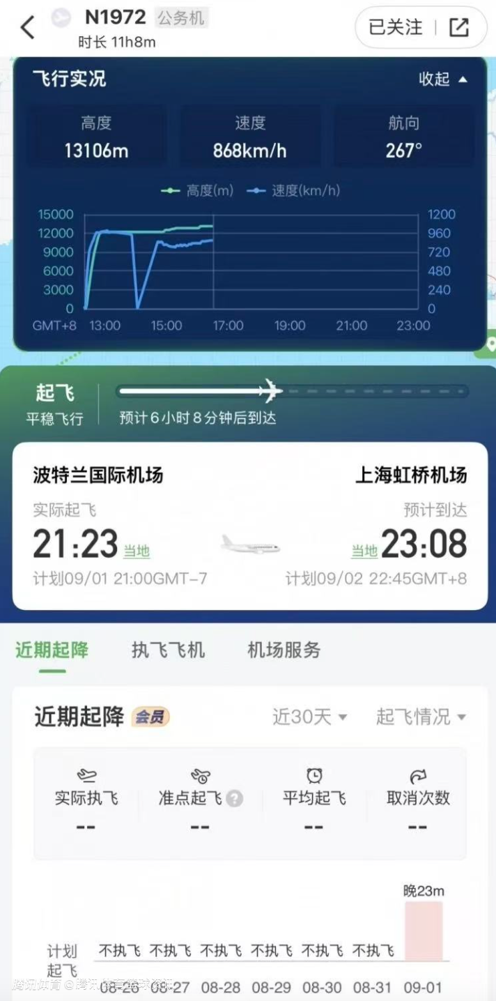 2025-09-02 22:00北京时间9月2日,据多家航空出行APP上所显示的航班信息,一架编号为N1972的公务机已经于当地时间21:23分从波特兰国际机场起飞,预计将于北京时间今晚23:08分抵达上海虹桥机场,航程为11时8分。