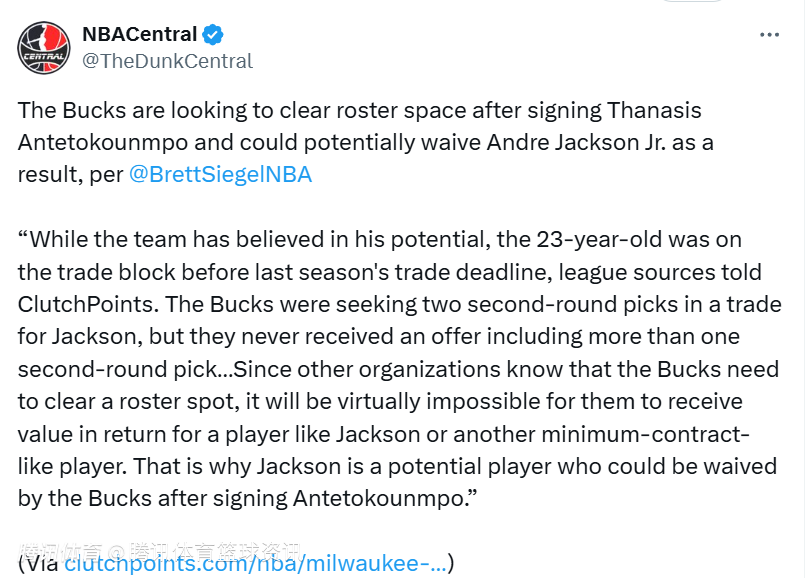 Brett Siegel表示:“联盟消息人士透露,尽管球队一直看好这位23岁球员的潜力,但在上赛季交易截止日前,小安德烈-杰克逊就被摆上了交易货架。雄鹿队曾希望通过交易杰克逊得到两个次轮选秀权,但始终没有收到包含超过一个次轮签的报价。由于其他球队都清楚雄鹿需要腾出一个阵容名额,他们几乎不可能通过交易杰克逊或其他类似拿着底薪合同的球员来获得相应回报。这就是为什么在签下萨纳西斯后,杰克逊成为了雄鹿队潜在的裁员对象。”