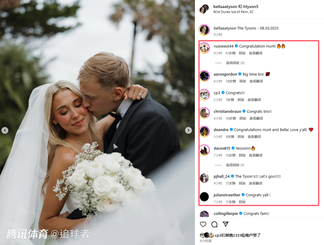 今年休赛期至今,联盟已经有多名球员举办婚礼,卡鲁索正式结婚,比尔补办婚礼宴请亲朋好友,威少在游艇上举办浪漫的仪式庆祝结婚10周年;如今掘金球员亨特-泰森也结婚了,他在社媒上晒出结婚照,身穿黑色西装,妻子则是身穿婚纱,两人在亲朋好友的见证下深情亲吻。