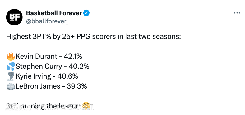 随后BF写道:“四大巨星依然统治着联盟的三分时代。”