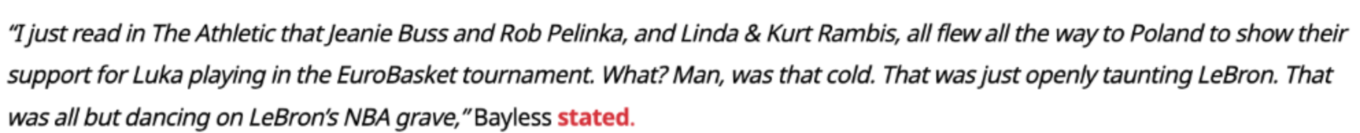“佩林卡甚至称东契奇是球队的门面。这很可笑,詹姆斯仍然是联盟的门面,仍是整个篮球界最受喜爱的球员。但显然,湖人队高层已经明明白白地表示,他们不想让詹姆斯执行下赛季5250万美元的球员选项。显然,他们希望他在自由球员市场上把天赋带到其他地方。”
