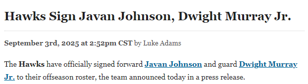 小德怀特-穆雷同样在2023年选秀中落选。2023-24赛季,他先效力于黑山联赛的KK莫纳尔队,随后加盟大学公园天鹰队。在上赛季为天鹰队出战的43场比赛中,穆雷首发出战29场,场均登场23.9分钟,可得9.0分、5.1次助攻和3.8个篮板,三项命中率分别为39.1%、31.5%和76.2%。 尽管老鹰队未披露约翰逊与穆雷的具体合同细节,但结合两人背景可推测,两份合同大概率为Exhibit 10合同。