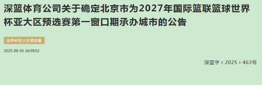 2025-09-04 07:20北京时间9月3日,根据中国篮协官方社媒公示,经公开征集、申办单位提交材料、城市考察、综合评估并报中国篮球协会及国家体育总局批准,现选定北京市为2027年国际篮联篮球世界杯亚大区预选赛第一窗口期承办城市。