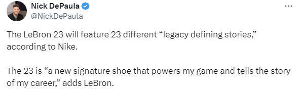 耐克官方此前正式推出了勒布朗-詹姆斯的第23代签名鞋,据报道,詹姆斯职业生涯的故事将通过23款配色逐一呈现,首款配色“未知领域”(Uncharted)率先登场,以此致敬勒布朗-詹姆斯成为NBA史上首位突破40000分大关的球员。詹姆斯的第23代签名鞋将在9月25日于中国率先发售,之后在10月3日开始全球发售。