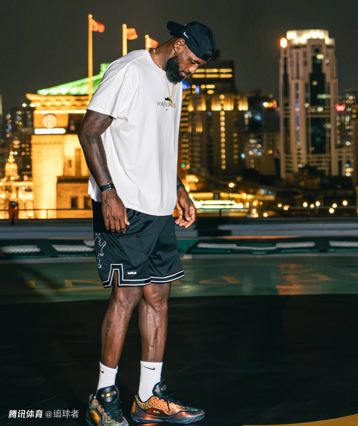 2025-09-04 10:10北京时间9月4日,湖人超级巨星勒布朗-詹姆斯正在中国行,耐克官方晒出詹姆斯的最新动态,昨晚詹姆斯身穿黑色短裤和印有“Forever King(永恒之王)”的白色T恤,在霓虹夜景中与东方明珠合影,展示自己的第23代战靴。