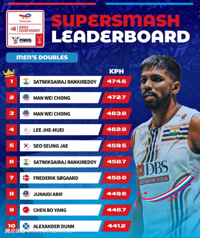 男双方面,印度组合成员兰基雷迪的KPH为474.5,排在第一,陈柏阳以446.7排在第九。
