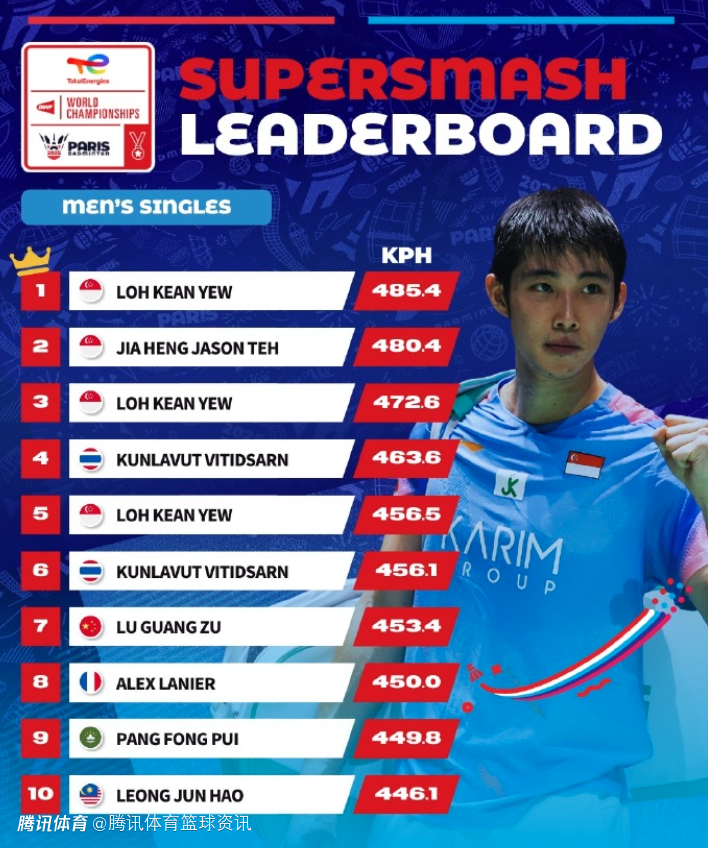 男单方面,骆建佑的KPH来到485.4,为第一名,中国选手陆光祖的KPH为453.4,排在第七。