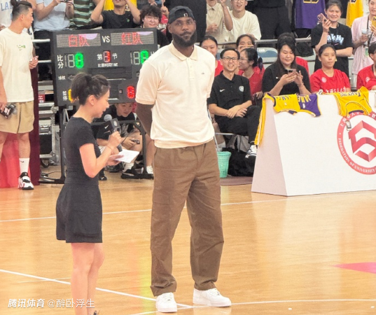 詹姆斯来到现场可谓是盛况空前,尤其是当他说“你好”时,观众席爆发出热烈欢呼。詹姆斯在现场与身穿30号球衣的上海交大球员互动时,轻拍了一下后者的臀部以示鼓励,还给小女孩的篮球签名。