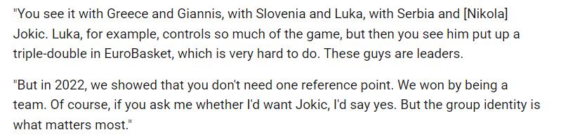费尔南德斯说道:“希腊队正证明自己是本届欧洲杯的有力竞争者,斯潘诺里斯找到了正确的取胜之道。这种强队风范在多支队伍中都有所体现:希腊队与字母哥、斯洛文尼亚队与东契奇、塞尔维亚队与约基奇。以东契奇为例,他掌控着比赛的大部分进程,即便如此,他还能在欧洲杯中交出三双数据,要知道这绝非易事。这些球员都是球队的领军人物。但在2022年,我们(西班牙队)证明了球队并非一定要依赖某一个核心球员。我们凭借团队协作赢得了冠军。当然,如果你问我是否希望队中有约基奇这样的球员,我的答案会是肯定的。但团队凝聚力才是最重要的。”