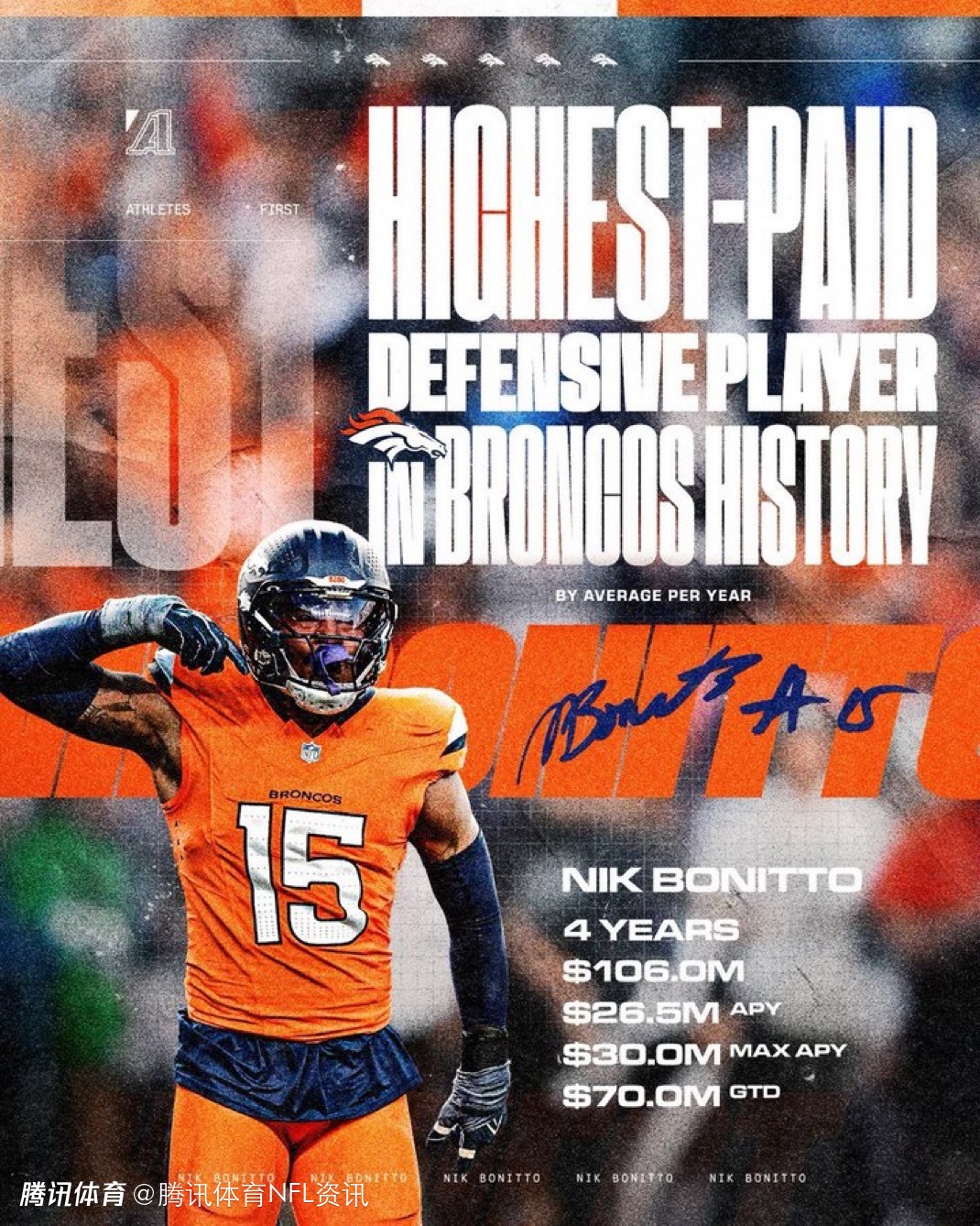 【NFL动态】野马与防守端锋尼克-博尼托达成四年续约 合同总值最高可达1.2亿美元