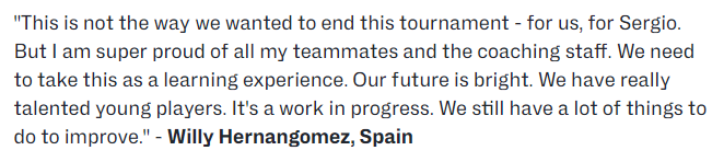 威利-埃尔南戈麦斯说道:“我们原本不想以这样的方式结束本届赛事,无论是对我们队员,还是对塞尔吉奥-斯卡里奥罗教练来说,都是如此。但我为所有队友和教练组感到无比自豪。我们需要把这次经历当作一次学习的机会。球队的未来是光明的,我们拥有极具天赋的年轻球员,目前仍在不断成长进步。要变得更好,我们还有很多事情要做。”