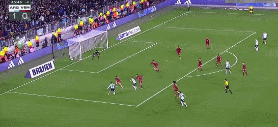 第39分钟,阿尔瓦雷斯扣开门将后无私横传,梅西吃饼挑射破门,阿根廷1-0领先委内瑞拉。