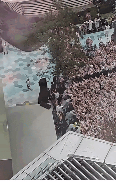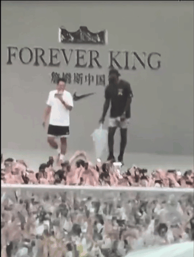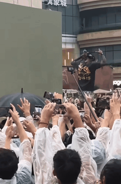 随后,詹姆斯现身万象城,并且来到外场和等候多时的球迷见面,他在登台后果断扔掉工作人员给到自己的雨伞,冒雨和现场球迷互动,做出比心和戴皇冠的动作,张开双臂和全场球迷合影,并且用中文喊道:“你好,成都。”