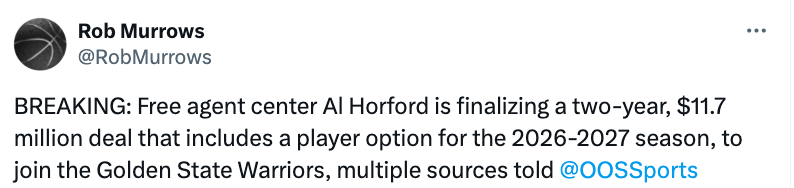 2025-09-06 00:00北京时间9月5日,据美记Rob Murrows报道,霍福德将和勇士签下一份2年1170万的合同,其中26-27赛季为球员选项。