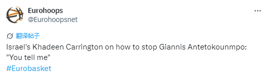 当被问及以色列队该如何限制字母哥时,以色列球员卡迪恩-卡林顿给出了一个直白的回答:“你倒说说看。”