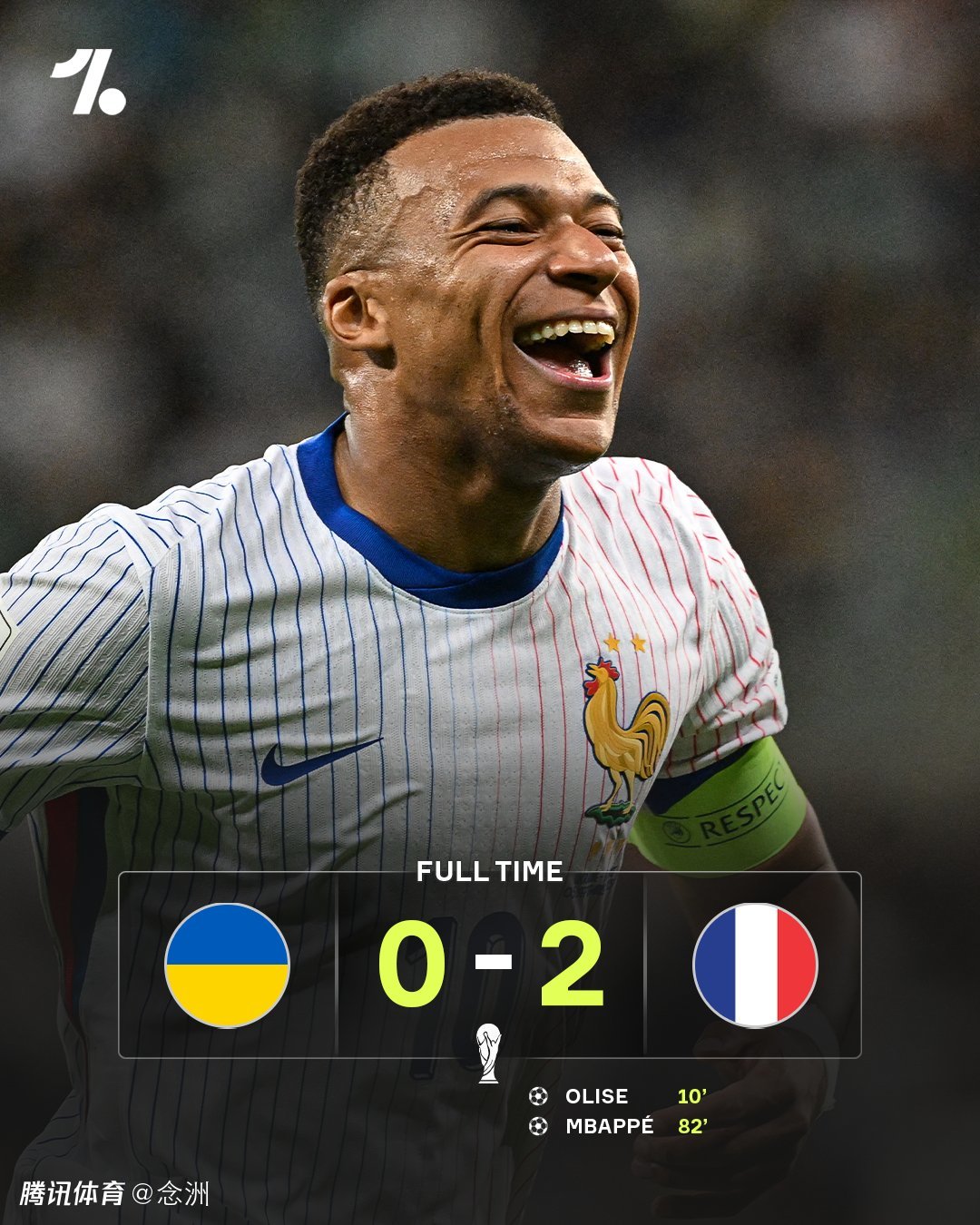 世预赛欧洲区D组第5轮,法国客场2-0击败乌克兰,取得开门红。巴尔科拉助攻奥利塞破门,扎巴尔尼中柱,巴尔科拉失单刀,登贝莱替补登场后伤退,姆巴佩锁定胜局。