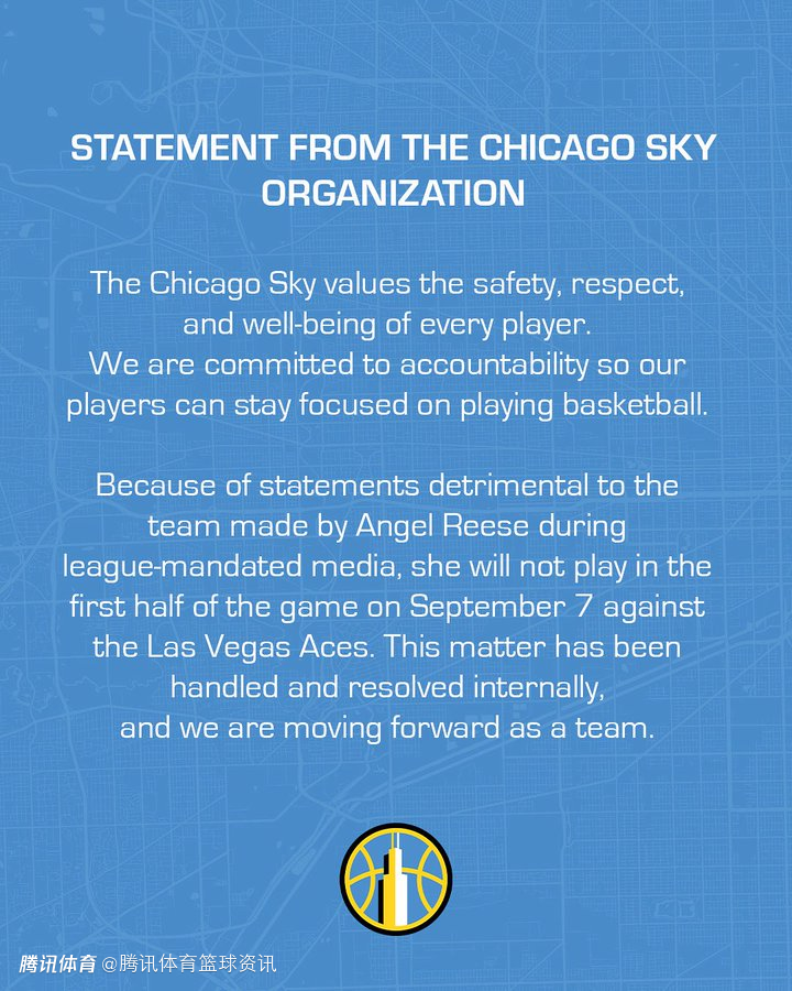天空队在官方声明中写道:“芝加哥天空队重视每一位球员的安全、应受的尊重及身心健康。我们致力于落实问责机制,让球员能专注于篮球比赛本身。由于安吉尔-里斯在联盟强制要求的媒体活动中发表了对球队不利的言论,她将无法参加9月7日对阵拉斯维加斯王牌队比赛的上半场。此事已通过内部渠道处理并解决,我们将以团队名义继续前行。”